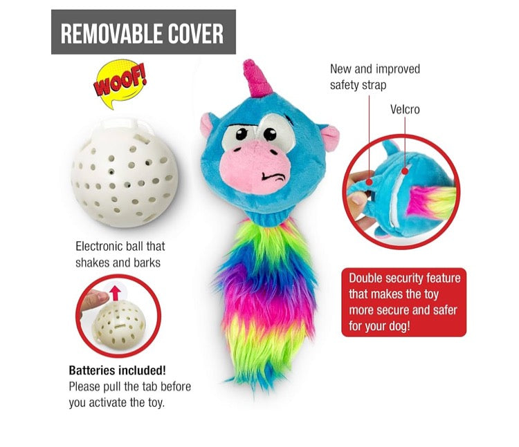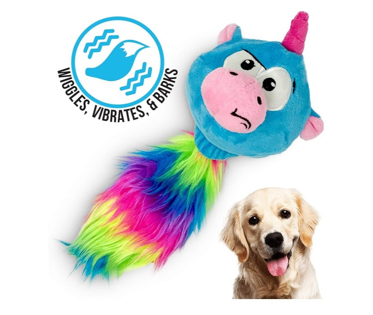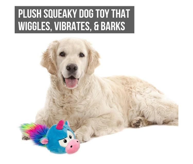 Engage your furry friend with the Hyper Pet Doggie Unicorn Interactive Plush. This plush squeaky dog toy wiggles, vibrates, and barks, promoting exercise and play for dogs of all sizes. Its erratic movements and funny sounds reduce anxiety and boredom, keeping your pup entertained. Easily activate the toy with a simple shake or by pressing the ON/OFF switch.