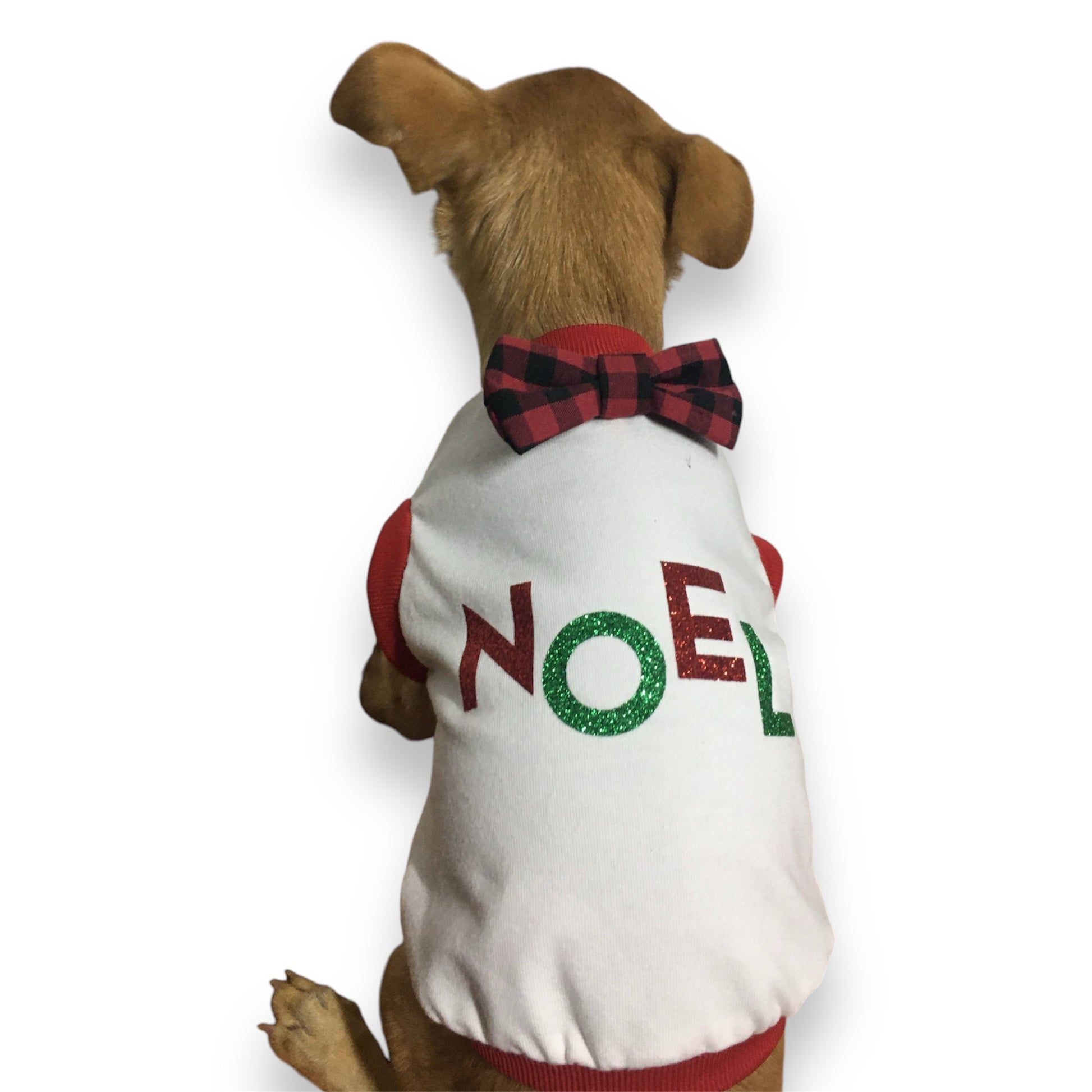 This designer sleeveless shirt, specifically made for pets, adds a touch of holiday spirit with glittery "Noel" text. The soft cotton fabric ensures comfort, while the handcrafted bowtie adds an extra level of charm. Perfect for festive gatherings and photoshoots.