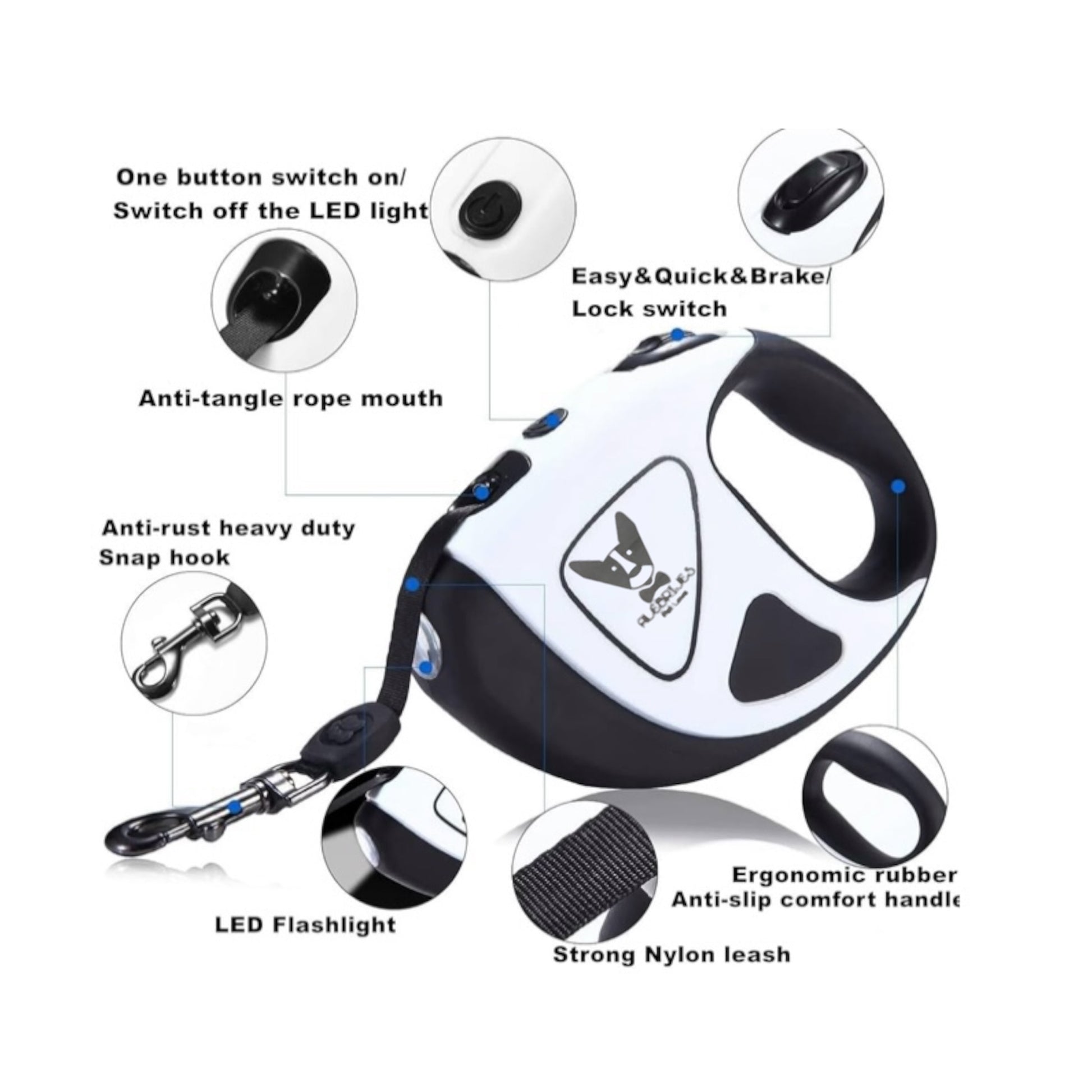 Expertly designed for daily use, this retractable dog leash offers safety at night with its built-in LED flashlight powered by 2 AAA batteries (not included).